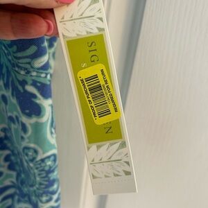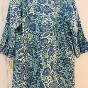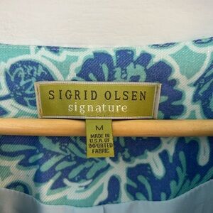 Elegant Sigrid Olsen tunic with a vibrant blue and green floral pattern. Features a single button closure and three-quarter sleeves.