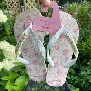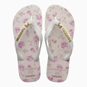 Say hello to your newest sunshine essential! These dreamy Sterling Dusk Ribbon Rosa flip flops feature a soft white base with dainty pink floral rose print. The prettiest pair for spring, summer, or vacation days. Part of the exclusive LoveShackFancy x Havaianas collab, they add a romantic touch to your everyday style.