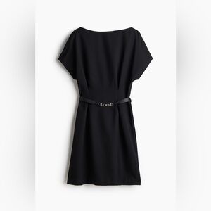This elegant black dress with black and gold belt detail is perfect for any occasion. Its sleek design offers a timeless look.