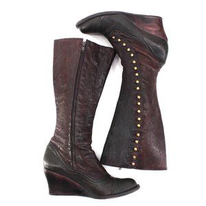 Calleen Cordero Knee High Boots 6.5 Black Brown Leather Brass Button Wedge Heel