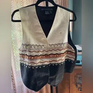 Stylish vest with intricate embroidery. Features a mix of black, white, and brown colors. Perfect for a bohemian look.