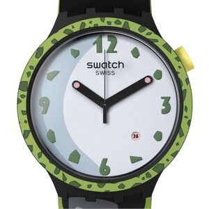 This warrior-worthy timepiece features a solid black case, a black bezel with a multi-colored print, a green strap with a bouble-sided multi-colored print and a white dial with green numbers.