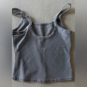 This ALO Yoga tank top in a sleek dark gray color features a minimalist design with thin straps and a delicate trim detail along the neckline. Crafted from a soft, thick fabric, it offers comfort and style for both lounging and casual outings. Size small, runs true to size. Excellent condition.