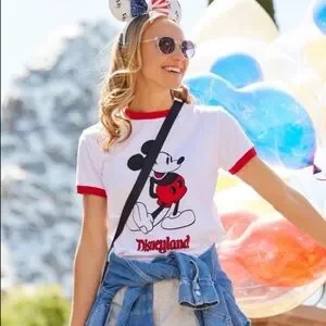 He's a cartoon classic. Mickey's timeless pose is always in style on this vintage-look ringer tee made from soft jersey knit fabric. Contrast collar and cuffs plus Disneyland logo make it a memorable souvenir.