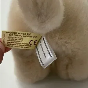 This delightful cream-colored plush dog features irresistibly soft fur and charming floppy ears. Its compact, puppy-like build and expressive black eyes make it a perfect companion for cuddling and imaginative adventures. A small medallion on its chest adds a unique touch to this adorable toy.