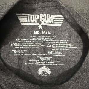 Official Top Gun Men's T-Shirt in excellent pre-owned condition. This gray graphic tee features the iconic Top Gun logo with an airplane and stars, perfect for fans of the classic movie. Minimal wear, no stains or holes. Made from a comfortable 60% cotton, 40% polyester blend. Sold out online.