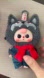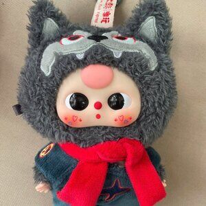 This adorable doll is dressed in a fluffy grey wolf-themed outfit, complete with pointed ears and embroidered facial details on the hood. With blushing cheeks, heart-shaped markings, and a vivid red scarf, this doll exudes charm and whimsy. A perfect gift or collectible item for fans of cute Korean-style toys.