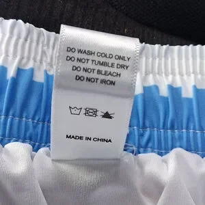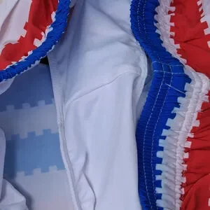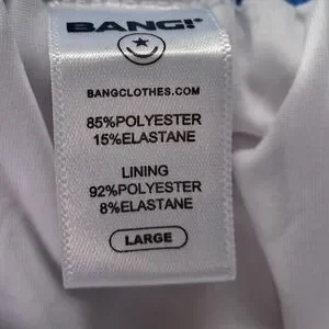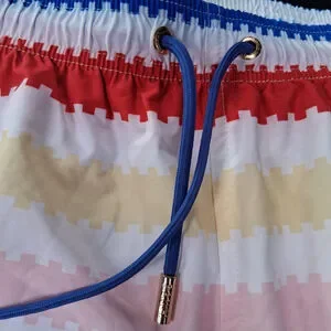 The Bang Miami Swim Shorts in Rainbow Stripe are men's mini swim shorts in size Large. Made from a blend of polyester and elastane, these machine washable in cold water only swim shorts feature a colorful rainbow stripe pattern, elastic waist with a drawstring, and a polyester lining for added comfort.