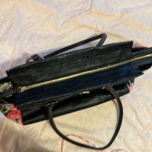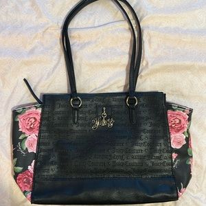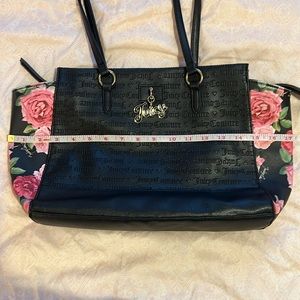 Chic black satchel featuring pink floral sides. Iconic Juicy Couture design.
