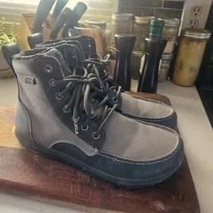 LEMS Boulder Boot grey/blue canvas and leather. Mens 9 / Womans 10.5. Zero Drop, Minimalist Boot. Worn about 10 times, images do show a little dry mud. Great boot but already have a pair.