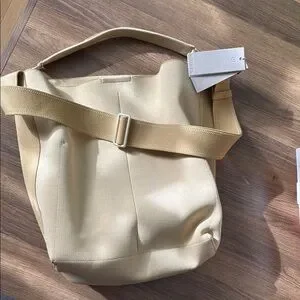 This cream shoulder bag by Rothy's showcases a relaxed, slouchy design, crafted from soft material for a minimalist and versatile look. The adjustable straps enhance its functionality, making it an ideal accessory for everyday use.