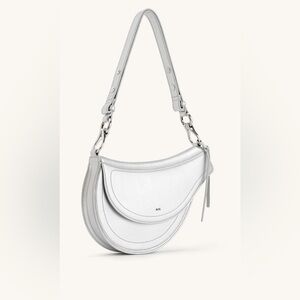 The JW PEI Silver Shoulder Bag showcases a sleek crescent shape with a minimalist design, perfect for modern style enthusiasts. Crafted with a smooth, polished finish and silver-tone hardware, this bag offers a sophisticated touch to any outfit. Its adjustable strap ensures versatile carrying options, making it a practical yet elegant accessory.