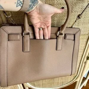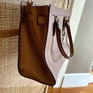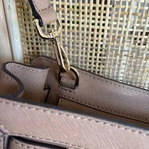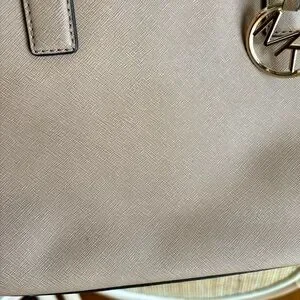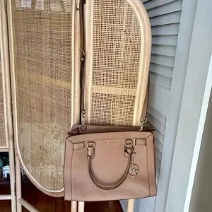 Gorgeous tan saffiano leather MK bag in excellent condition, one very small spot on bag, as pictured. Interior zip and 6 slip pockets, slip pocket on back wall. Handles 5" drop, Shoulder strap 21" drop (adjustable)