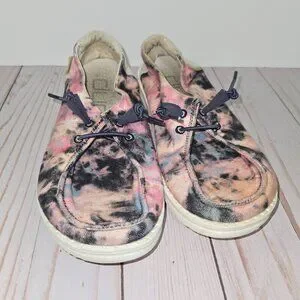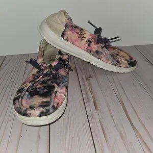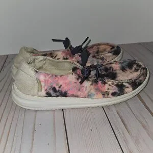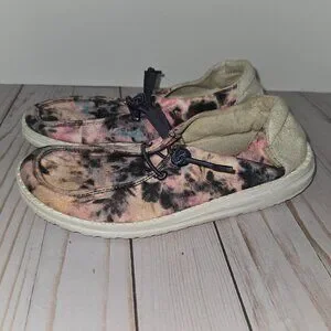 These are pre-loved, pre-owned Hey Dude Wendy Youth Tie Dye Navy shoes in Youth size 3 or Ladies size 4. This comfortable, slip-on moccasin features a breathable, seamless stretch knit upper and a lightweight, UltraLight EVA outsole for all-day comfort. The unlined design ensures maximum breathability, while the no-tie elastic laces make it easy to wear. Equipped with an anatomical, breathable leather-lined removable memory foam insole for superior support, this versatile shoe is the perfect blend of style and comfort. Ideal for casual wear, it’s a must-have addition to your footwear collection!