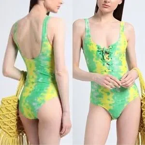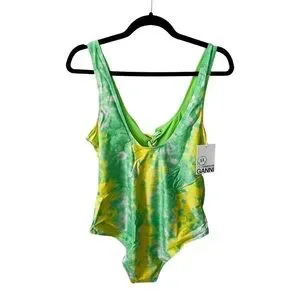 NWT GANNI Tie Dye Lace-up Green Yellow One-piece Swimsuit Sz 42