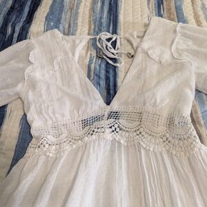 The HYFVE dress is a vibrant white and lace that is perfect for any event. This sundress features a playful ruffled design with a smocked bodice and a tiered mini skirt. The plunge neckline and puff short sleeves add a touch of elegance to its breezy silhouette. Model is wearing this dress in Orange but the actual dress that is for sale is white. I got a picture of the model to show what it would look like on. Dress is fully lined. Excellent condition.