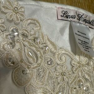 Experience the allure of this Linea Donatella chemise, crafted in a pristine white hue with exquisite lace detailing. The lightweight fabric drapes beautifully, offering a romantic and airy feel. Ideal for special occasions, this piece embodies elegance and sophistication.