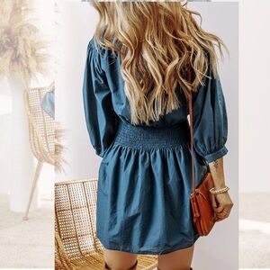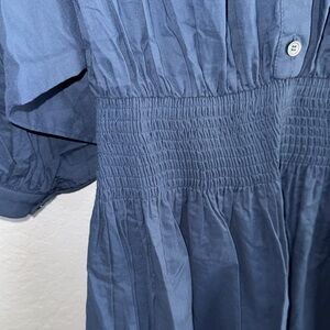 Chic teal dress with smocked waist. Button-up front. Three-quarter sleeves. Perfect for casual outings.
