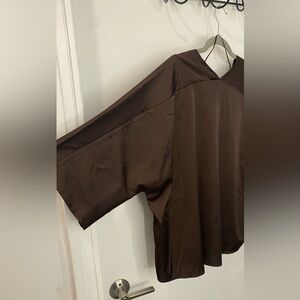 This Banana Republic blouse features a rich brown hue and a boxy silhouette, perfect for a chic and modern look. The 3/4 sleeves and buttoned front add a touch of elegance to this versatile top, making it a stylish choice for any occasion.