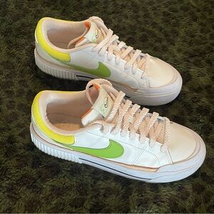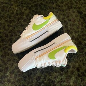 Stylish Nike sneakers for women. Features a vibrant lime swoosh. Comfortable and trendy design. Platform bottom, light wear, super cute !