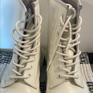 Condition: Great used condition. From a distance you can’t tell as much but being a white boot all marks are easy to see when up close. They’ve been worn a handful of times and have minimal wear just visible marks. There are several scuffs and marks on both boots. See images for more details.