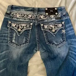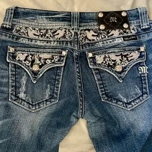 These Miss Me boot cut jeans feature a classic blue hue with stylish distressing and fading effects for a trendy, worn-in look. The denim showcases contrast whiskering and natural wear patterns, adding character to the traditional denim weave. Perfect for a casual day out, these jeans offer both style and comfort with a pinch of spandex for the ideal fit. Perfect pre-lived condition. Size 28
