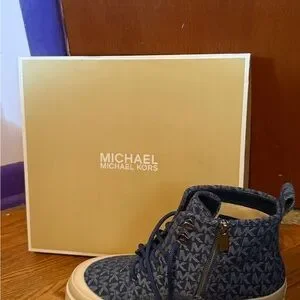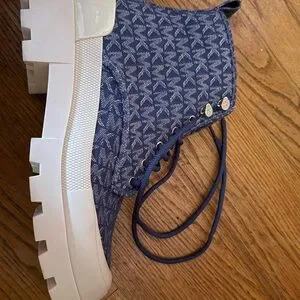 Chic denim sneakers by Michael Kors. Features iconic MK pattern.