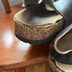 Classic Birkenstock sandals. Comfortable cork footbed. Adjustable straps for a perfect fit. Please note wear around sole, integrity of sandal is not impacted.