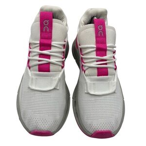 These sneakers feature a sleek white mesh upper with vibrant pink accents, offering a modern and eye-catching look. The cushioned midsole provides comfort for both running and everyday activities. With a streamlined silhouette, these shoes combine functionality with contemporary style.