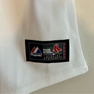This women’s-cut Red Sox Baseball Jersey is size Medium and never worn. Features a classic white design with stitched letters. Button-up. 100% polyester