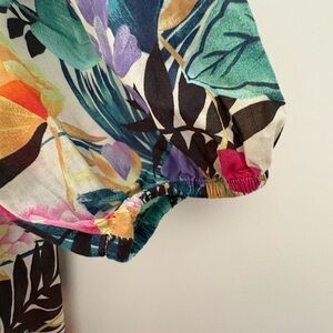 This stylish top from Mango in Spain features short puff sleeves and a fluttery neckline. The vibrant colors add a lively touch, making it perfect for warm weather outings. Its lightweight fabric ensures comfort and breathability throughout the day.