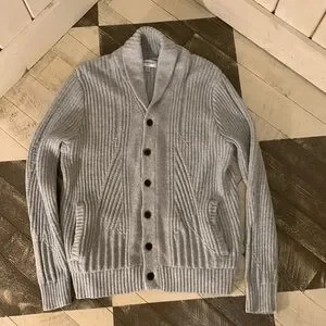 Shawl collar cable knit with front pockets.