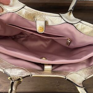 Coach Gold and Brown women signature Tote Bag with leather flower accents