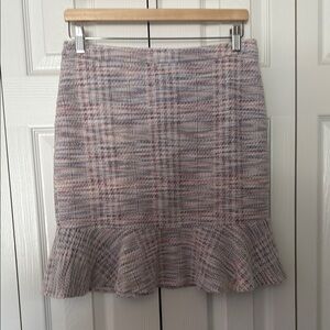 This chic mini skirt from Banana Republic combines a classic pencil silhouette with a playful ruffled hem, perfect for both work and cocktail occasions. The gray and white tones create a sophisticated look, while the structured fabric ensures a polished appearance.