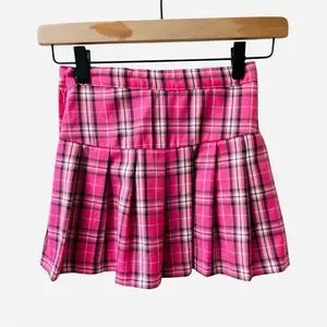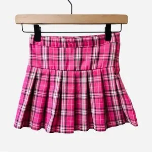 Chic pink plaid skirt with pleats. Ideal for casual wear.