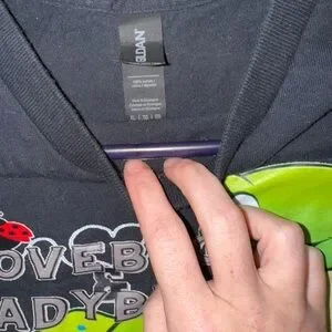 Gildan black t-shirt featuring a vibrant green and red graphic. Ideal for everyday style.
