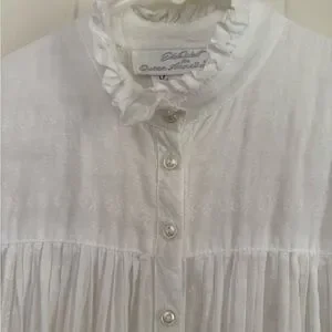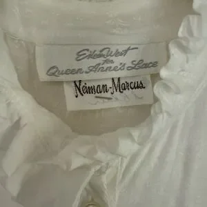 This exquisite romantic and very feminine white gown by Eileen West is designed with elegant pleating and a sophisticated mock neck, ideal for a maternity gown, a romantic dress for any occasion or a special lingerie dress. The 3/4 bishop sleeves add a touch of drama, while the Mandarin collar enhances its refined style. Ruffled neck and hem. Button down front from color to ruffled hem.