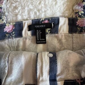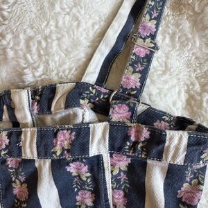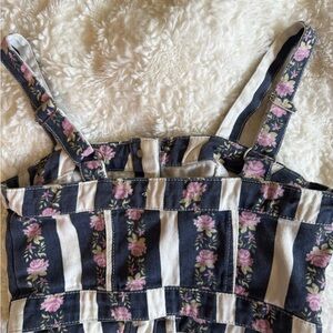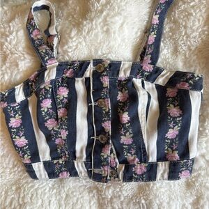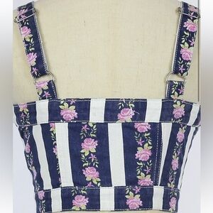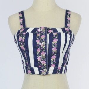 Forever 21 Women’s Striped Floral Denim Print Button-Front Crop Top Y2K Jean Bustier Style. Features a button front for closure and adjustable straps. Only worn once! In excellent condition. Size small.