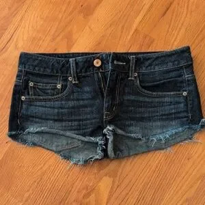Dark blue jean shorts with frayed hem. Classic five-pocket style. Ideal for casual wear.