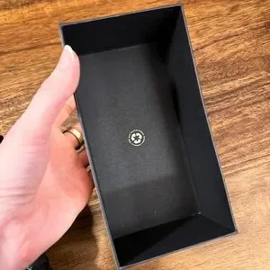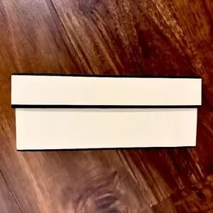 • FYI: This box has a small "bubble" on the exterior upper right side. "Bubble" = cream paper is slighly pulling away from the black box . Blemish is small, does not impact use of box. I tried to capture this in the side photo - see photo #4 posted.