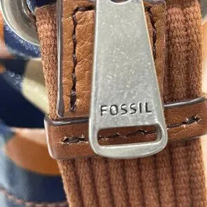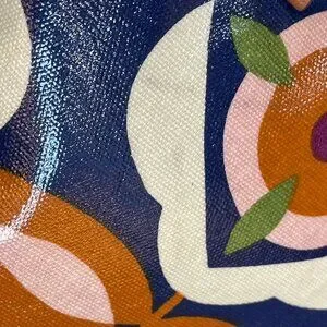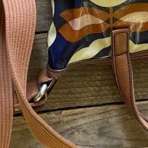 Turn heads and brighten sidewalks with this eye-catching vintage Fossil Key-Per crossbody bag, bursting with bold retro-floral energy. Featuring a navy vinyl backdrop with playful mod-inspired blooms in burnt orange, ivory, and olive, this messenger-style tote is as durable as it is delightful. It’s fully lined with a top zip closure, dual handles, and an adjustable canvas strap for hands-free convenience.