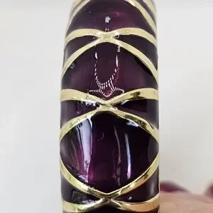 Gorgeous plum colored metallic enamel and gold wash clamper bracelet designed by Kenneth Jay Lane. Stamped with his hallmark. Size fits sizes 7 to 8" wrists. It is 1.5" wide. Lovingly cared for. Looks brand new!
