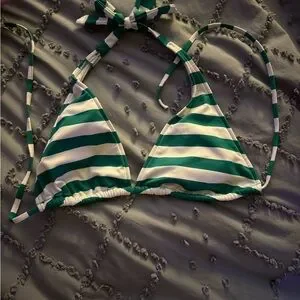 Stylish green and white striped bikini top. Perfect for beach days.