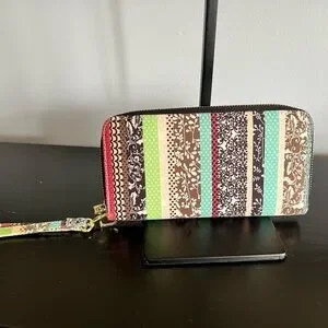 Stylish and vibrant, this multicolor patterned wallet is perfect for adding a pop of color to your accessories. Ideal for everyday use. 8” x 4.5” with 8”drop handle