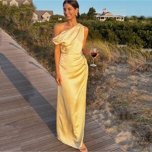 An elegant asymmetrical silhouette crafted in yellow satin with a draped neckline and sultry side slit