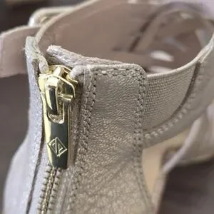 NWOT Donald Pliner Junnah Pale Gold Strappy Heel Sandals Women's Size 7.5M. Its square-toe design features a criss-cross antique metallic leather upper that wraps around your foot. The sandal is elevated with a bold block heel and easily fastens with a back zip closure. Sandals also have a cushion memory foam insole and the flexibility of the buffed leather outsole, which also offers added traction with its rubber forepart. Smoke-free and pet-free home.