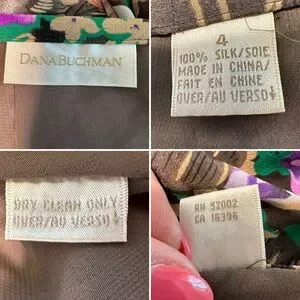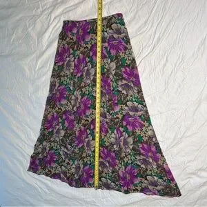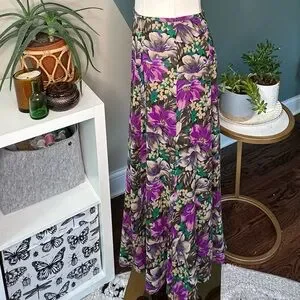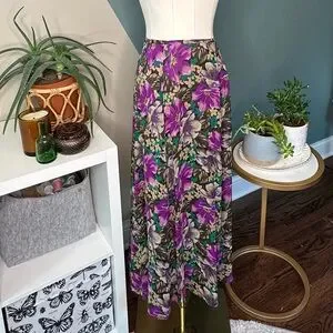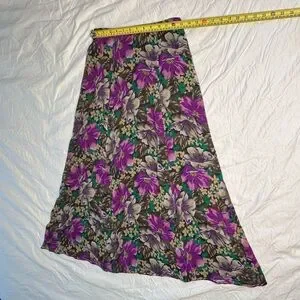 Step into effortless elegance with this vintage Dana Buchman 100% silk midi skirt, dating from the late 1990s to early 2000s. Crafted from luxuriously soft silk and featuring a striking painterly floral print in jewel-toned purples, greens, taupes, and blacks, this bias-cut skirt skims the body with graceful movement.