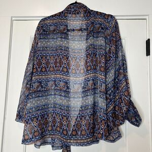 Free People Solstice Shimmer Tie Front Kimono in Geometric Blue and Orange Print. One size fits most, measurements below. Excellent preowned condition