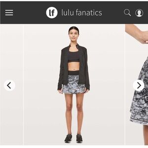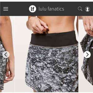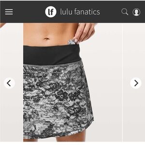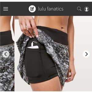 This athletic mini skirt from Lululemon is in like new condition. It shows absolutely no flaws or signs of wear, the rip tag is still intact and in great condition. The skirt has many great features like, built in shorts with pockets and grippy silicone lining along the bottom of the shorts, hidden pockets in the waistband, and a zip pocket in the back waistband. The skirt itself is a lightweight material and it features a unique pattern.