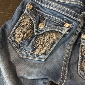 Miss Me Bermuda Jean shorts size 10 for girls. The shorts have the signature white threading on the entire Jean. The back pockets have angel wings with silver and black leather strips and black sparkly stones. They have been worn but are in great condition. See the last photos where the leather tag studs are missing but it is stitched on. Missing a few jewels on back pockets. See last photos